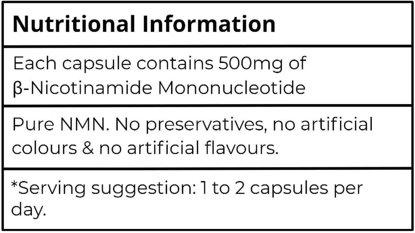 • High Potency: Each capsule delivers a potent dose of 500mg of NMN, a key precursor to NAD+, a vital molecule for cellular energy production.