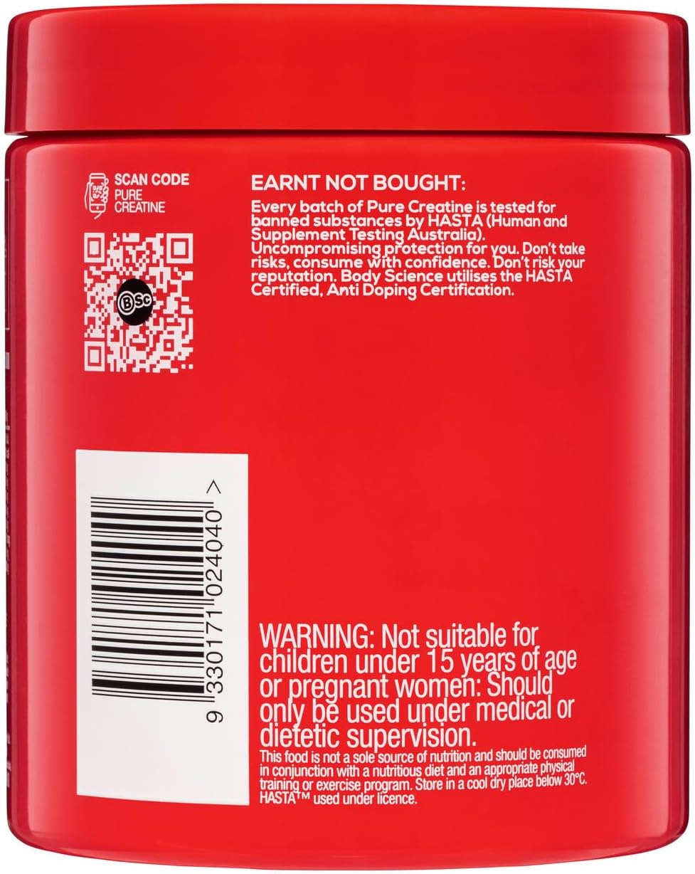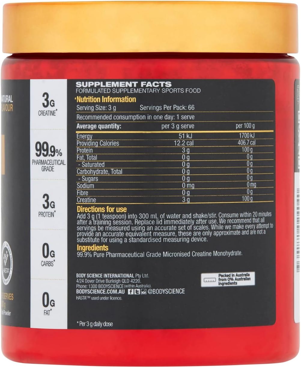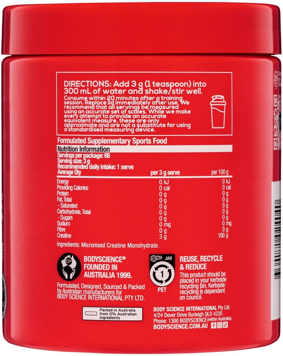 Creatine has been a powerful supplement over the years especially for athletes and bodybuilders. Its a three amino acid peptide that helps supply energy to all cells in the body and its primary function is to supply energy to muscles thus making it responsible for an individual's muscle development that results in massive gains as well as leaner and stronger physique. There are a lot of creatine supplementation available in the market but, are you going to let this pass? Introducing the all new and improved Pure Creatine from the legendary BSC Body Science. Creatine by BSC will surely provide your muscles with the world's purest and highest quality form of creatine in its Natural Flavour. This 200g-tub will give you 66 serves of pure micronised creatine with zero fillers and GMO. BSC Creatine takes charge in Cell Volumisation where creatine causes the water inside the muscle cell to increase that promotes protein synthesis. It also allows taker to increase and enhance the training capacity because creatine enhances the resynthesis of the cells energy source, Adenosine Triphosphate (ATP). This can allow a higher training intensity to be maintained, which may ultimately lead to a greater stimulus for muscle growth.If you're serious about your muscles, then have Creatine by Body science. Creatine Key Features Increases Muscle Size and Strength Improves Performance Boosts Energy Faster Recovery Promotes Lean Muscle Mass 100% Pure Pharmaceutical Grade Creatine Creatine Suggested Use MAK Fitness recommends taking 1 serve (3g) of BSC Creatine each day.