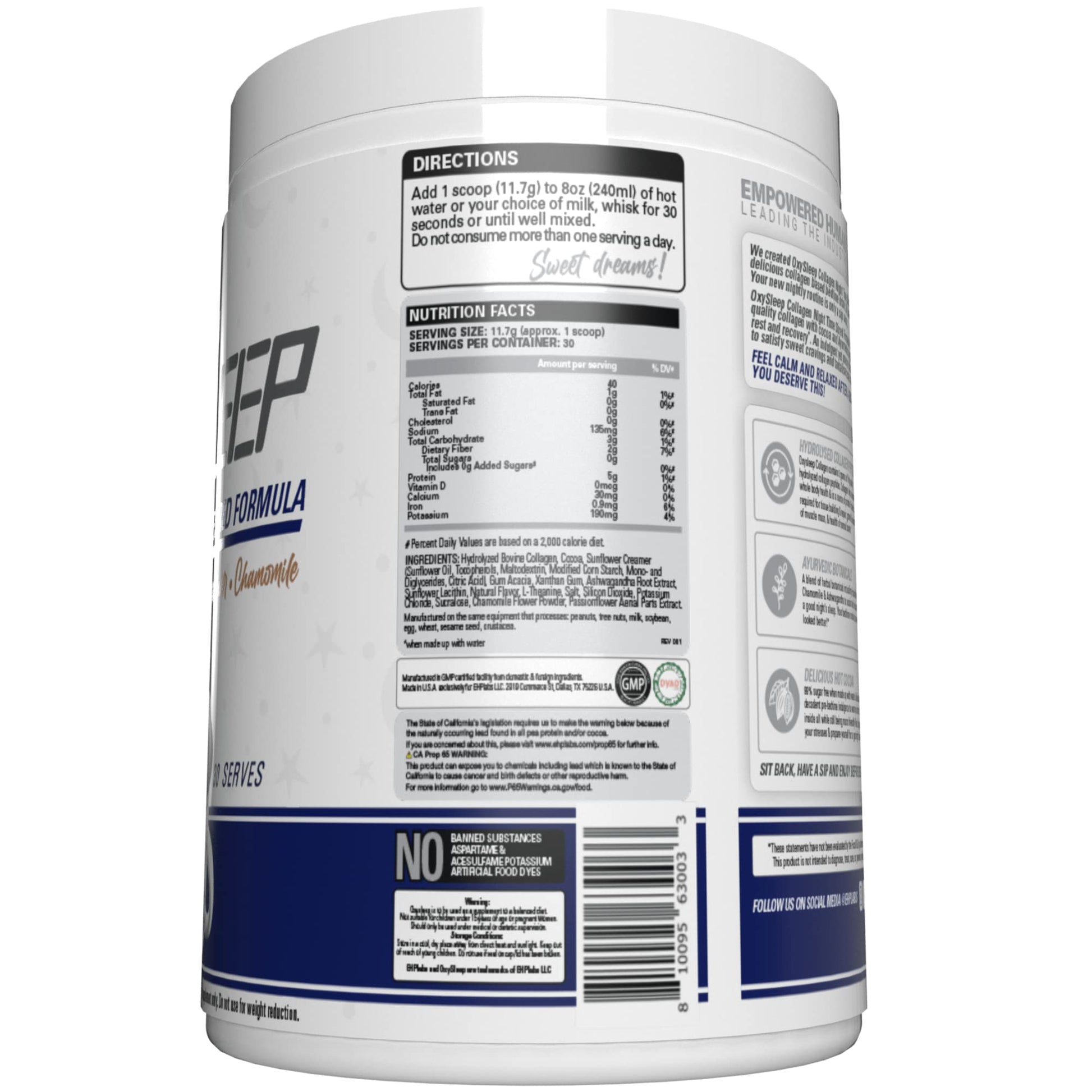 OxySleep Collagen Night Time Shred is a delicious dairy and gluten free collagen-based powder, designed to be taken as a night-time beverage. Day-to-day stresses, lack of sleep and even exercise elevates a stress-response hormone called cortisol. When left unmanaged, this may increase abdominal storage and contribute to weight gain whilst decreasing recovery, performance, strength and mental clarity. Helps to build muscle mass, boost metabolism, and shredding. This decadent hot cocoa is enhanced with L-Theanine, Ashwagandha, Chamomile flowers and Passionflower to promote restful deep sleep which is essential for healthy shredding, recovery and overall wellness. At only 40 calories per serve and 99% sugar free, it will satisfy your late-night sweet cravings and provide you with whole-body benefits from bovine collagen to support healthy hair, skin, nails, joints and gut.