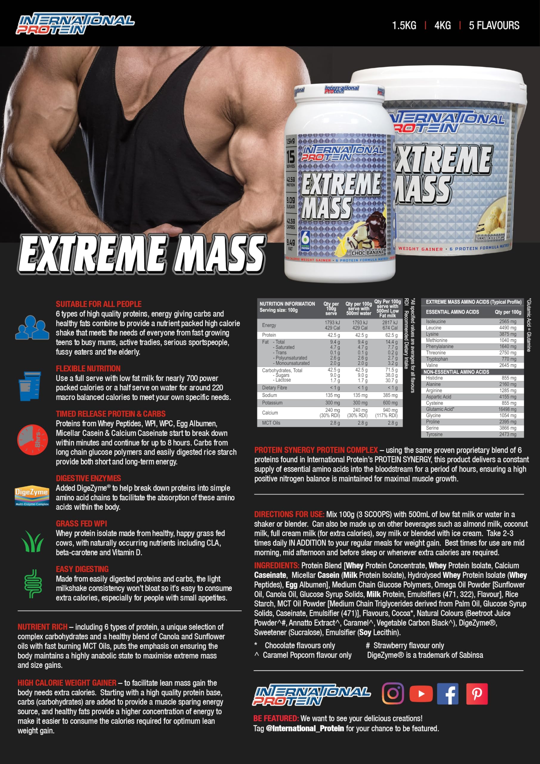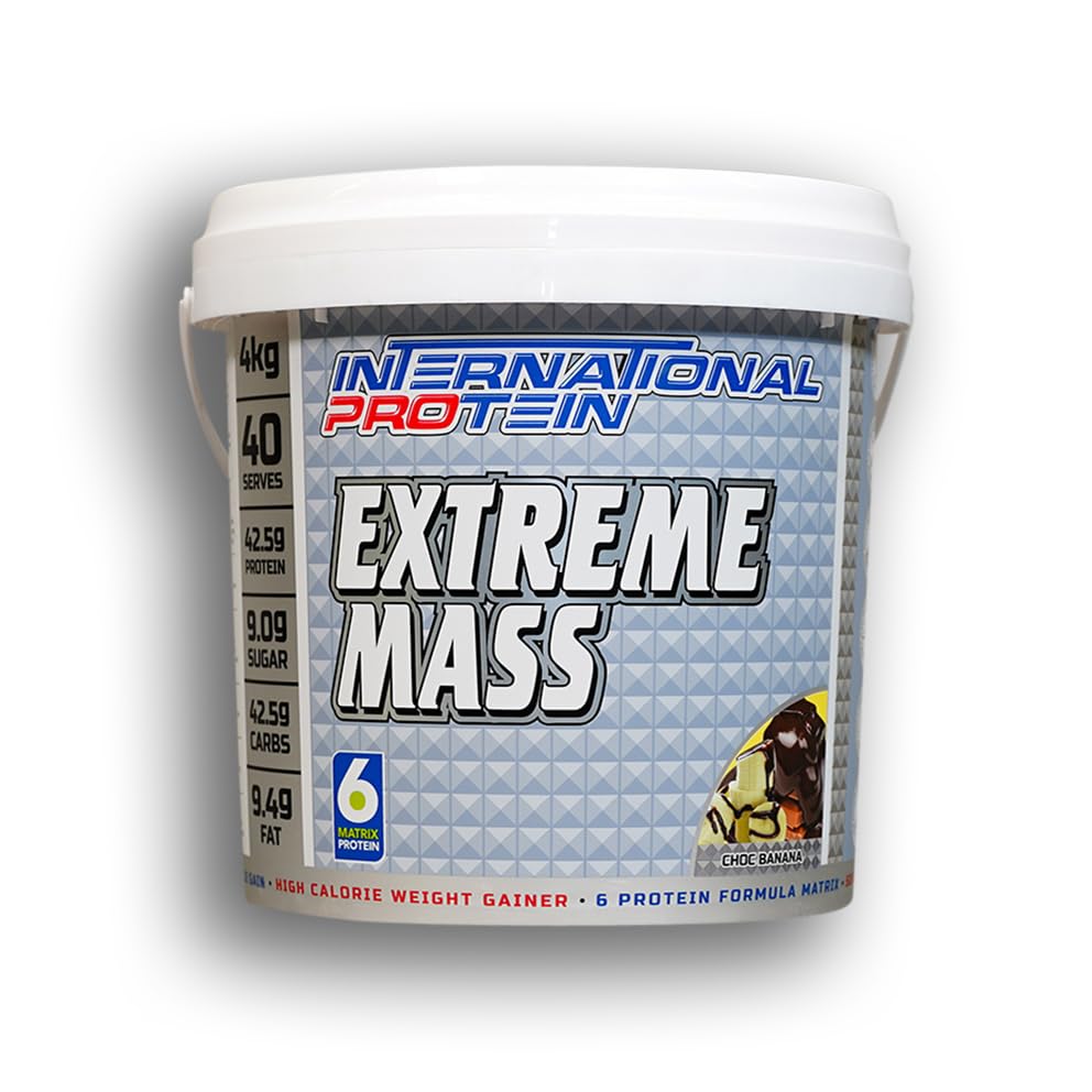 International Protein Extreme Mass Choc Banana Flavour Weight Gainer Protein Powder is a dangerously anabolic weight gainer protein powder. It has been formulated as a powerful mass gainer supplement to help you increase your muscle size. It tastes incredible and is perfect in a pre-workout shake or as an on-the-go calorie boost. The nutrient-rich formulation features five types of protein, including whey peptides, WPI, WPC, micellar casein and egg albumen. Extreme mass is a dangerously anabolic weight gainer protein, designed for serious mass gainers. This mass gainer includes 5 types of protein as well as a unique selection of complex carbohydrates and a healthy blend of canola and sunflower oils combined with fast-burning MCT Oils. It puts the emphasis on ensuring the body maintains a highly anabolic state to maximise extreme mass and size gains. It is a genuine energy-rich high-calorie weight gainer, not just a carbohydrate-heavy formulation that is passed off as a mass gainer. To facilitate lean mass gain, the body needs extra calories. While carbs (carbohydrates) can offer you a muscle-sparing energy source, they still only provide the same energy as protein. Delivers a higher concentration of energy than protein and carbs to make it easier to consume the calories required for optimum nutrition that promotes lean weight gain. Hydrolysed Whey Protein Isolate (Whey Peptides). High Glycomacropeptide Whey Protein Isolate (WPI). Whey Protein Concentrate (WPC). Micellar Casein (Milk Protein Isolate). Egg albumens. Grass-fed whey has been shown to be far more nutritious than other types, containing an increased amount of vitamin E and omega-3 fatty acids.