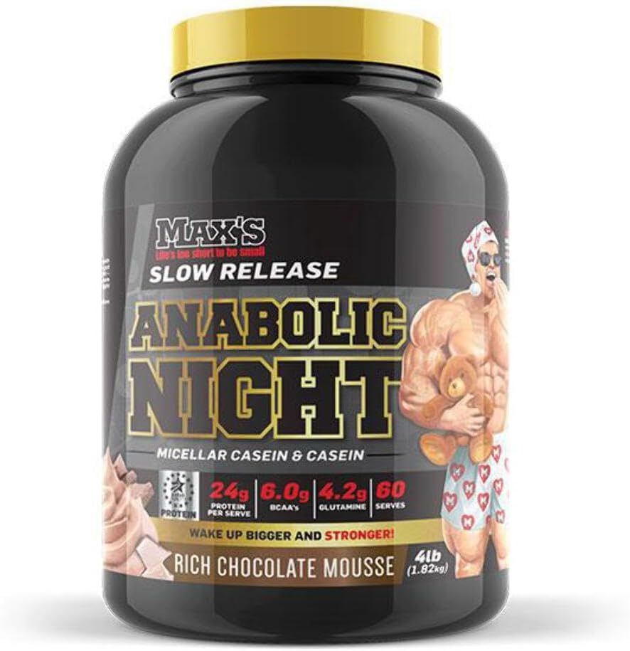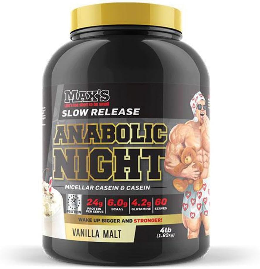 Max's Anabolic Night is Australia best-selling night protein. It provides up to 8 hours of continuous protein release to keep you recovering and growing all night. Up to 60 percent of new muscle growth occurs while you sleep - if you give your body the right nutrients. Don't waste your hard hours in the gym with poor nighttime nutrition - Use Anabolic Night and wake up bigger. The Max's Anabolic Night is ideal because it contains medium and slow release proteins that won't overload your system or disrupt sleep. Micellar Casein is an ultra slow digesting and absorbing, anti-catabolic protein that inhibits muscle breakdown after hard training and stimulates muscle growth. This unique new form of Casein is refined to keep the milk peptide molecules intact, producing an un-denatured, highly bioactive protein to stimulate growth and improve health. Clinical trials show Micellar Casein can sustain elevated blood peptides and amino acids levels for up to 8 hours to maximize growth while you sleep. Calcium Caseinate is a slow digesting and absorbing protein that is ideal for night use and for trainers with a faster metabolism. During digestion, it releases bioactive peptides to enhance anabolic growth and improve your metabolism. Whey Protein Concentrate is a medium digesting and absorption protein with a superior muscle building amino acid profile and contains high levels of immune and health-enhancing protein fractions including lactoglobulin, lactoalbumin, glycomacropeptides, bovine serum albumin, immunoglobulins, lactoferrin, lactoperoxidase and the growth factors IGF-1, IGF-2 and TGF. Comes in 1.82 kg bottle. Available in vanilla malt flavor.