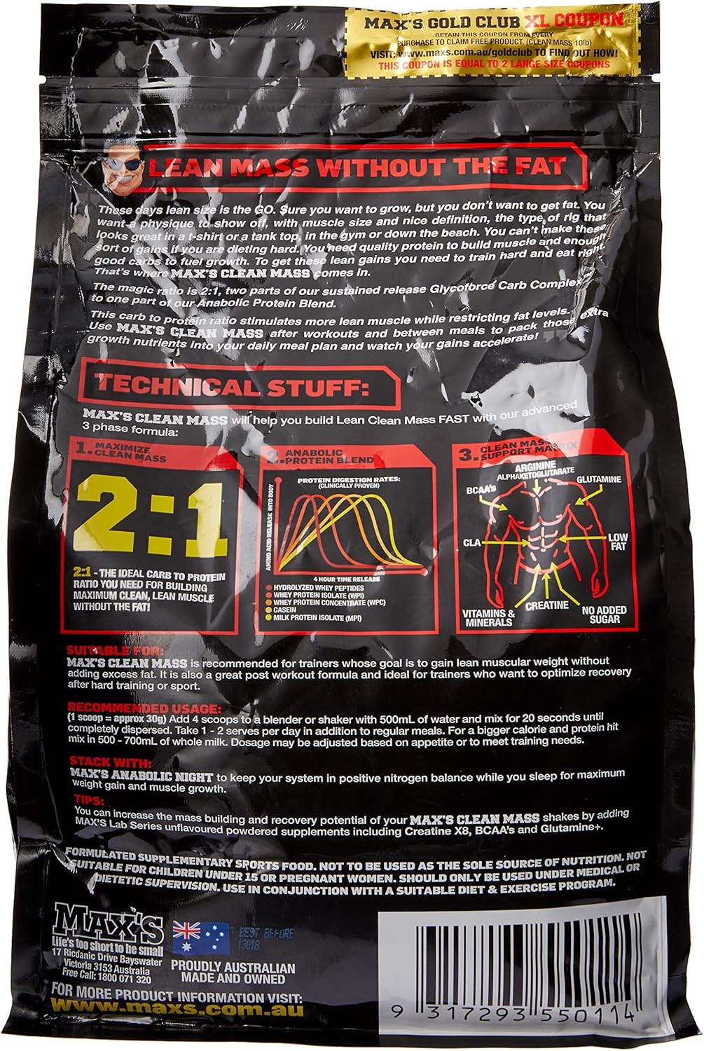 Max's Clean Mass provides the perfect carb to protein ratio to pack on lean muscle Mass. Clean Mass combines our sustained release GlycoForce Carb System with our fast, medium and slow release Anabolic Protein Blend in a 2: 1 ratio - ideal for adding size without fat. To help support the maximum growth we also include specific amino acids and potent activators that fuel recovery and stimulate protein synthesis. All proteins have specific characteristic, strengths and weaknesses. Whey is fast acting – ideal for taking after training but not a good choice before bed when you need slow release. This specific combination of fast, medium and slow dairy proteins pushes out the growth window by several hours. You stay anabolic for longer, you pack on more muscle, get stronger, bigger and more powerful. Our Hydrolyzed Whey Peptides are produced by treating purified Whey Protein Isolate with specific enzymes that cleave the peptide bonds of the whey protein structure to produce shorter peptide chains. Whey Protein Isolate is natures best protein for building lean muscle. It is purified from milk using an advanced two-stage Cross Flow Technology of Ultra and Microfiltration to produce a pure, un-denatured WPI with high bioactivity and highest bioavailability. Casein gels in your stomach during digestion which means it is slower to digest and absorb. Milk Protein Isolate - this natural blend of 20 percent Whey and 80 percent Casein, also contains Micellar Casein, the slowest digesting dairy protein. Micellar Casein is known for its anti-catabolic properties and can sustain elevated amino acid levels for up to 8 hours. Max's Clean Mass is recommended for trainers whose goal is to gain lean muscular weight without adding excess fat. It is also a great post-workout formula and ideal for trainers who want to optimize recovery after hard training or sport. Comes in 2.72 kg jar. Available in chocolate fudge sundae flavor.