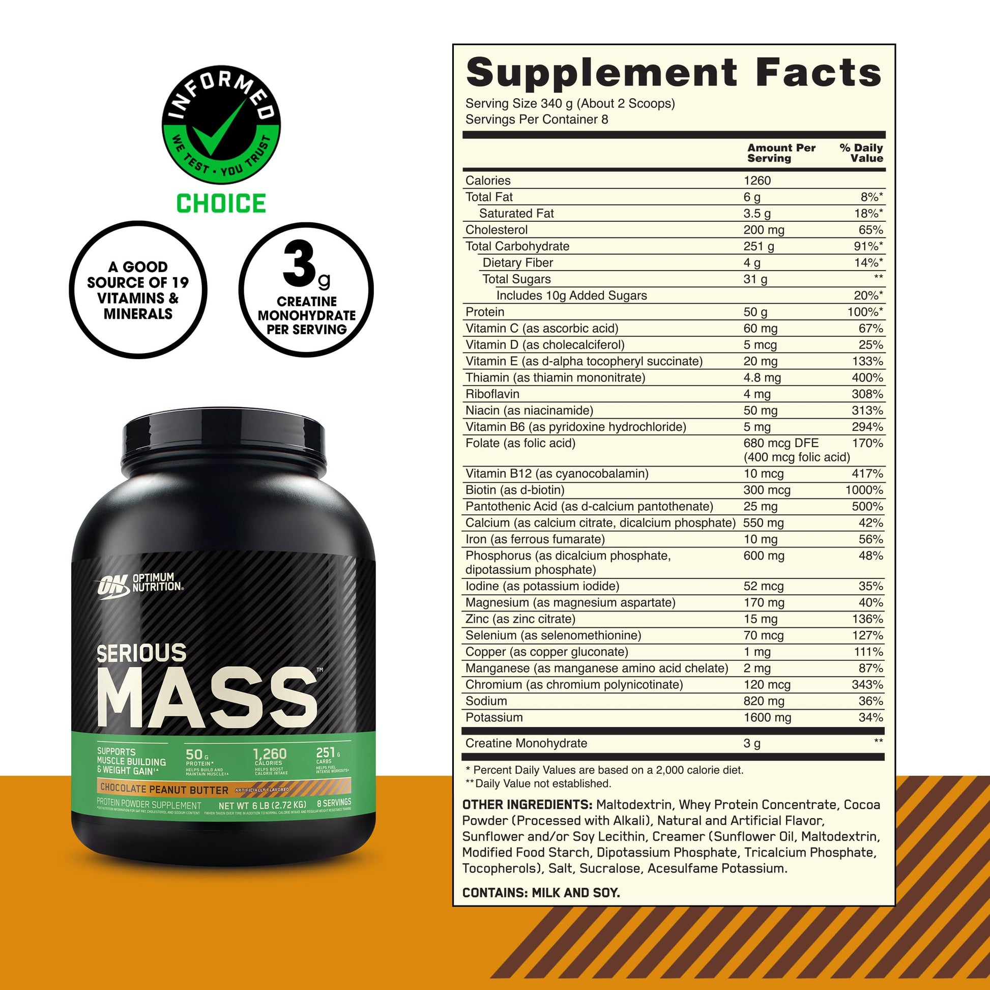 Serious Mass is the ultimate in weight gain formulas. With 1,250 calories per serving and 50 grams of protein for muscle recovery support, this instantized powder makes the ideal post-workout and between meals shake for sizing up your goals. Serious Mass provides you with the tools you need to pack on the pounds and help you develop the physique you’ve always wanted.