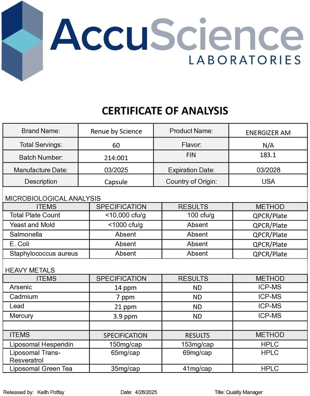 - QUALITY AND SAFETY ASSURED - Energizer AM is manufactured in a GMP compliant, FDA registered facility, and undergoes rigorous third-party testing to ensure the highest quality standards for your well-being.