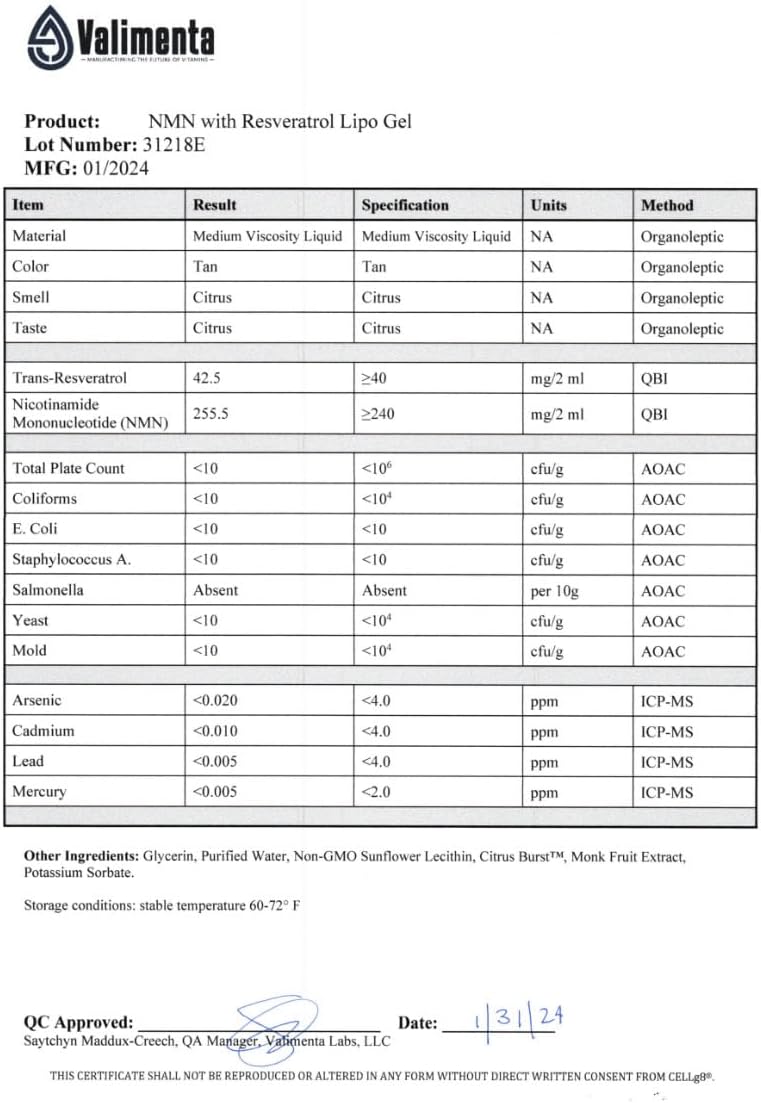 - QUALITY AND SAFETY ASSURED - NMN w/Resveratrol (Liposomal Gel) 150 mL is manufactured in a GMP compliant, FDA registered facility, and undergoes rigorous third-party testing to ensure the highest quality standards for your well-being.