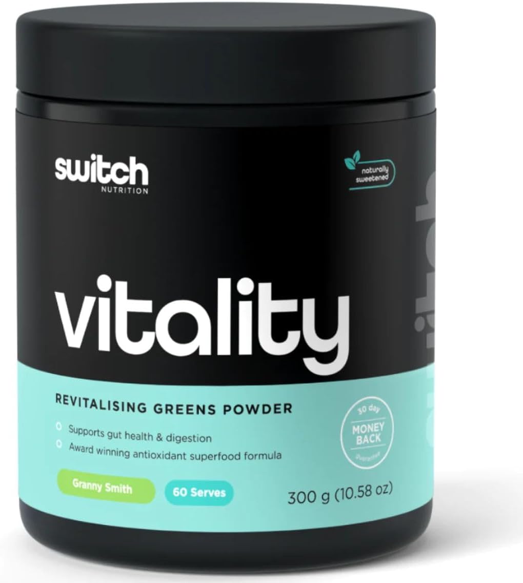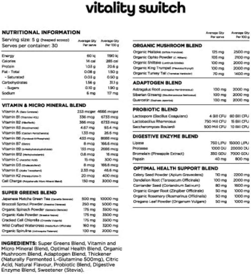 Vitality Switch Vegan is an All In One Revitalising Super Greens Wholefood Powder. The 35 ingredients have been hand-selected to provide you with some of the planet’s healthiest nutrients. It contains 5 amazing blends to optimise your body's systems. Bio-active multivitamin blend to provide 33% of your RDI. ○ Siberian Ginseng to enhance energy, reduce fatigue, improve gut health and support immunity. ○ All flavours are now vegan Gut And Vegan Collagen Boosting Blend: Our gut and vegan collagen blend is designed to help support your needs. We have added an amino acid and micronutrient blend to help support natural collagen production. Our carefully selected 3 strain heat stable probiotic blend may help you fight the baddies in your belly. Super Greens Whole Food Blend: Our blend of organic, spray free and sustainably farmed greens will help to support your nutrient requirements. This blend will supply you with concentrated extracts yielding antioxidants, vitamins and minerals you may be missing from your everyday diet. Our Super Greens formula will also provide great diversity! Organic Mushroom Blend: Our blend of Super Fungi may help support the vital systems of your body. Many of the Organic mushrooms in this blend have been used for centuries. Science is now catching up and showing how they may help your results. Digestive Enzyme Blend: A lot of people do their best to eat healthy, but their digestive systems may not be capable of breaking down and absorbing the nutrients found in their food. We have specifically added a super digestive enzyme blend to help you get the nutrients from the food you eat. Cleanse And Health Support Blend: Our entire formula will work together to support your bodies needs. We’ve specifically added Cell Charge as one of the planet’s richest sources of natural fulvic and humic minerals. This organic polyphenolic blend contains more than 70 minerals, amino acids and organic acids that may help support your body’s systems and